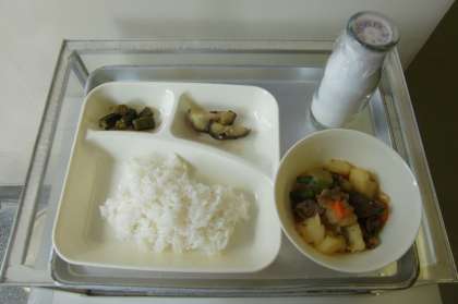 「肉じゃが」は子ども達に大好評の献立です。それに今が旬のなすを使った「焼きなすのみそだれかけ」と同じく旬のオクラを使った「オクラのおかかいため」を組み合わせて、季節感のある献立となっています。