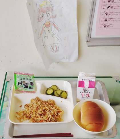 焼きそば・きゅうりのしょうがづけ・ソフト黒豆