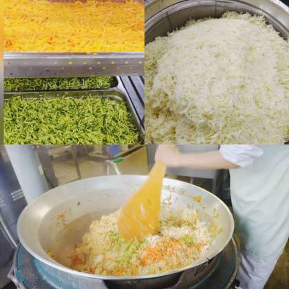 「ビビンバ」は、韓国・朝鮮の料理です。春のビビンバは、だいこんの代わりに切干しだいこんを使用しています。きゅうり、にんじんは焼き物機で蒸しています。切干しだいこんはゆでています