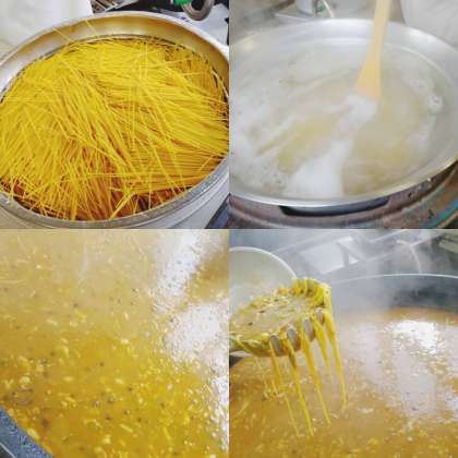 「カレースープスパゲッティ」は、鶏肉とベーコンを主材にしたカレー味のスープスパゲッティです。