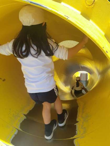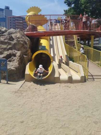 黄色のドーム型の滑り台は、かなりスピードが出ます。