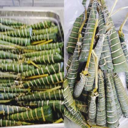 「ちまき」は、うるち米の粉などで作った餅を笹の葉で包み、い草で巻いて作られています。原材料は全て国産で、餅は愛知県の工場で製造、新潟県の工場で地元の熟練の職人が笹巻を行っています。市販されているものと比べ、糖分を控えた大阪市独自のものとして作られています。