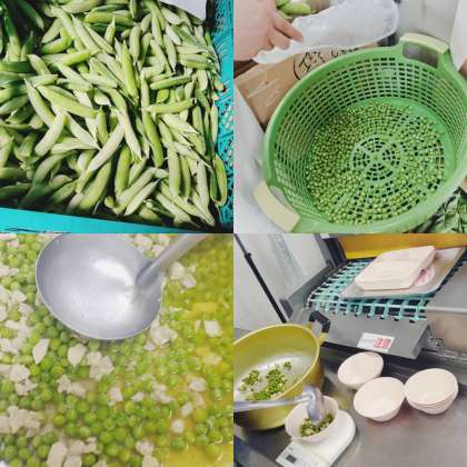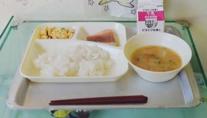 「えんどうの卵とじ」は、旬のさやつきのえんどうを給食室でむいて使います。鶏ひき肉は固まりやすいという反省から、 鶏肉(極小)に変更しています。この献立は、【鶏卵(液卵)】の個別対応献立です。