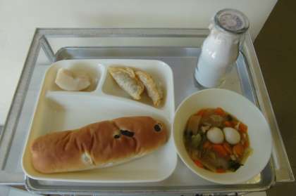 鶏肉と野菜のうま煮・あげギョーザ・なし(二十世紀)・レーズンパン・牛乳です。