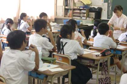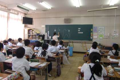 まず、教室で歯科衛生士さんから歯科保健指導を受けました。