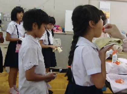 歯についての学習が済むと、丁寧に歯を磨き、1人ずつフッ化物の塗布を行いました。
