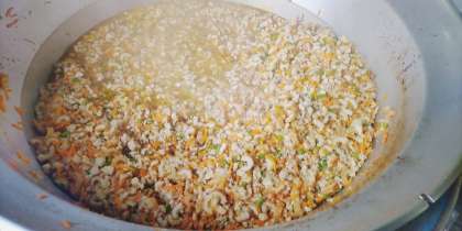 「かやくご飯」は、鶏肉、ちくわ、にんじん、さんどまめを具材にしています。きざみのりが1人1袋つきます。