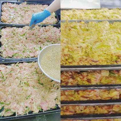 「豚肉のごまみそ焼き」は、豚肉にねりごま、赤みそなど で下味をつけ、たまねぎ、ピーマンを混ぜ合わせ、いりごまをふり、焼き物機で焼きます。