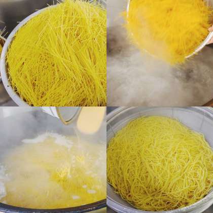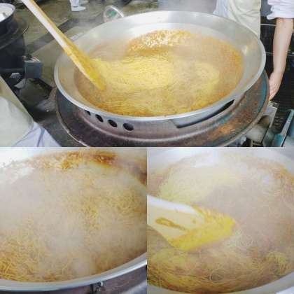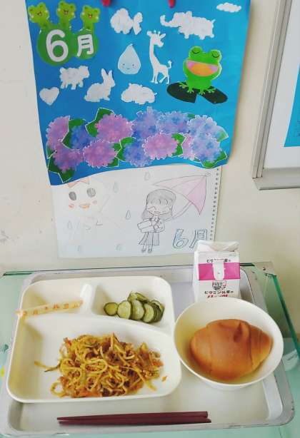 「カレースパゲッティ」は、豚ひき肉を主材に、ベーコンで旨みを増し、カレールウの素などで味つけしたスパゲッティです。児童に好評な献立です。