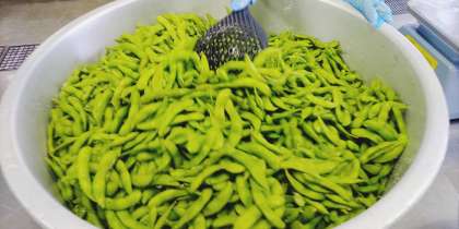 「えだまめ」は、焼き物機で蒸し、配缶時に塩をふりあえます。