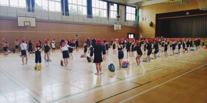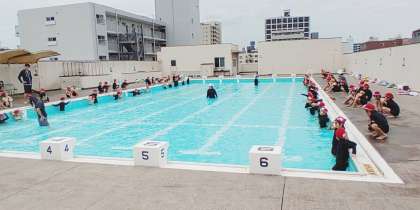 しっかりと体操をして、プールにむかいました。初めてのシャワーで、楽しく「かえるの歌」を歌いました。
