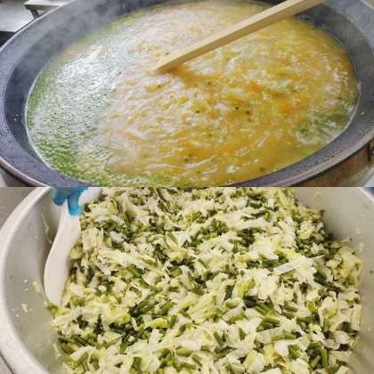 「キャベツとさんどまめのサラダ」は、キャベツとさんどまめを、焼き物機で蒸し、砂糖、塩、米酢、うすくちしょうゆ、綿実油で作ったドレッシングをかけ、あえています。