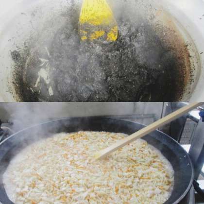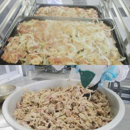 「豚肉の甘辛焼き」は、豚肉に砂糖、塩、こいくちしょう ゆで下味をつけ、たまねぎを混ぜ合わせて、焼き物機で焼きます。