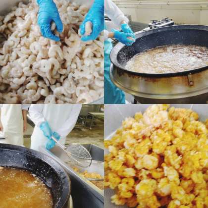 「えびのチリソース」は、塩、こしょう、料理酒で下味をつけたえびにでん粉をまぶし、なたね油であげます。しょうが、にんにく、トウバンジャンを香りよくいため、砂糖、こいくちしょうゆ、ケチャップを合わせた、少し辛味のきいたソースをからませます。
