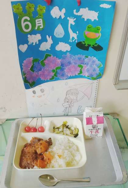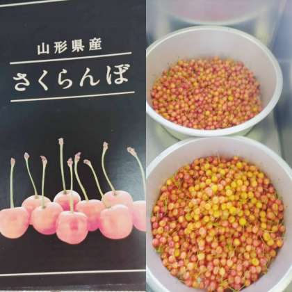 「さくらんぼ」は、山形産のものです。小学校は1人3コずつです。