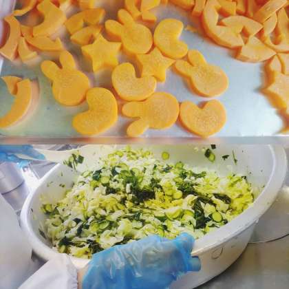 「ミックス海そうのサラダ」は、ミックス海そうとキャベツ、きゅうりを合わせ、砂糖、塩、米酢、うすくちしょうゆ、綿実油で作ったドレッシングであえています。