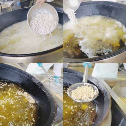 「ひじき豆」は、でん粉をまぶしてなたね油であげた大豆に、ひじきが入った甘辛い調味液をからませます。鉄や食物繊維を多く含む献立です。