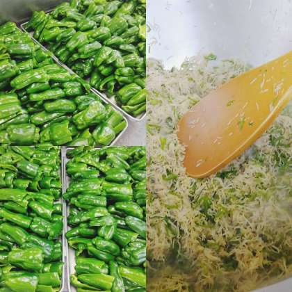 「牛丼」は、児童に人気の献立で、牛肉、糸こんにゃく、たまねぎ、にんじん、えのきたけを甘辛く味つけし、煮ています。斜め切りの青ねぎで彩りを添えています。