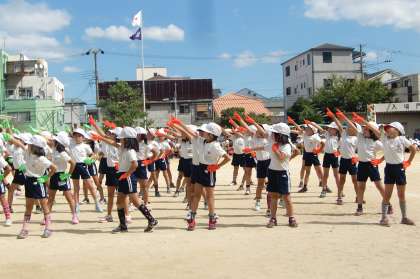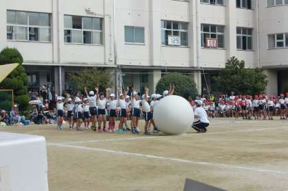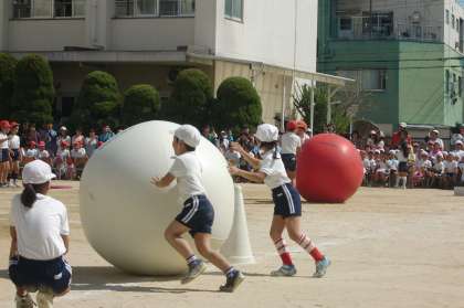 2年生は「ゴールをめざして」「大玉ころがし」「☆イロトリドリ☆」に出場しました。「大玉ころがし」は自分たちの身長より大きな赤と白の大玉を転がします。前が見えず悪戦苦闘しながら、それでも楽しそうに転がしていました。