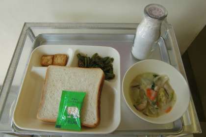 はくさいのクリーム煮・あつあげのしょうがじょうゆかけ・牛肉と三度豆のごまいため・食パン・牛乳です。