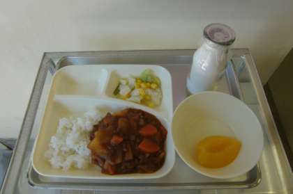 ハヤシライス・野菜サラダ・黄桃(缶)・牛乳です。