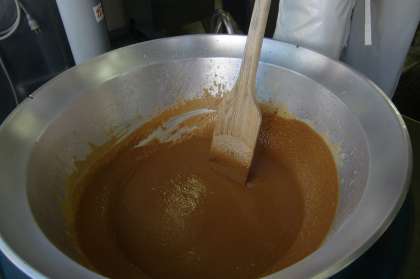 ハヤシライスのルウは、給食室で作ります。小麦粉と油をじっくりと炒めて、ブラウンルウに仕上げます。これを肉や野菜と煮込むことで、コクのあるハヤシライスに仕上がります。