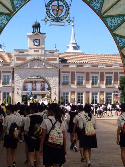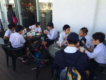 スペイン村の中でグループごとに思いっきり楽しんでいます。お昼ごはんを食べているグループもあります。