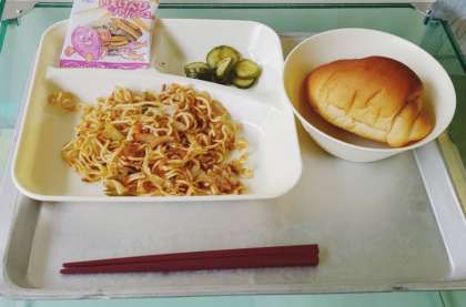「焼きそば」は、児童生徒に人気のメニューです。豚肉、いかを主材にしたソース味の焼きそばです。