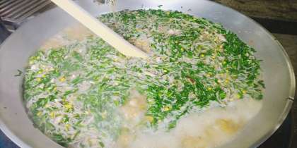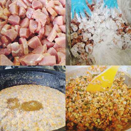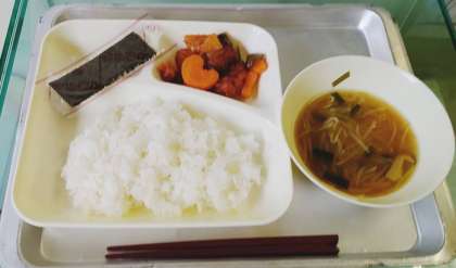 「酢豚」は、児童に好評な献立です。たまねぎ、下ゆでしたたけのこ、にんじん、ピーマンをいため、甘酢あんで味つけし、油であげた豚肉(角)を加えます。