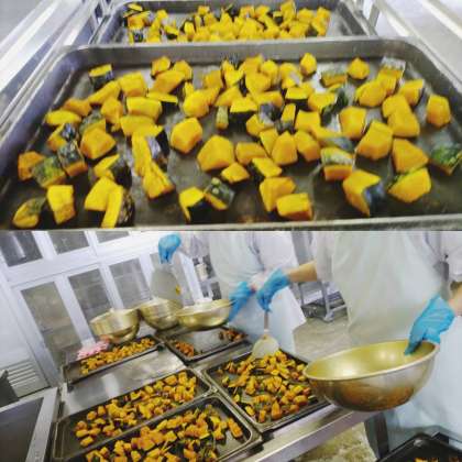 「焼きかぼちゃ」は、大切りにした生のかぼちゃに塩で下味をつけ、焼き物機で蒸し焼きにしています。