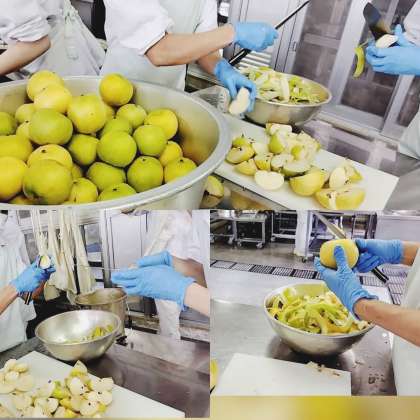 「鶏肉ととうがんの中華煮」は、鶏肉ととうがん、たまねぎ、にんじん、しいたけ、青みにむきえだまめを使用しています。最後にでん粉でと ろみをつけた中華風の煮ものです。