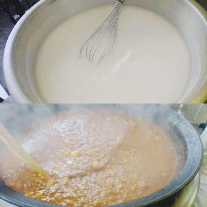 「ハヤシライス[米粉]」は、小麦アレルギーのある児童も食べることができるように、上新粉を使っています。牛肉、じゃがいも、たまねぎ、にんじんなどを使い、水どき上新粉でとろみをつけ、調味料で味つけして煮こみます。
