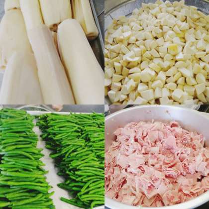 「ふきよせ煮」は 、鶏肉、旬のさといもやれんこん、しめじなどを使用した煮ものです。「ふきよせ」とは、数種類の煮ものなどを彩りよく盛り合わせた料理につけられる、日本料理の名前です。