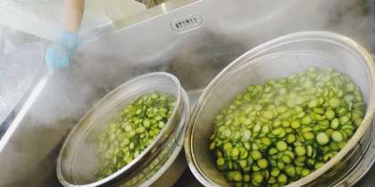「豚肉のねぎじょうゆ焼き」は、料理酒、砂糖、みりん、こいくちしょうゆ、綿実油で下味をつけた豚肉に、白ねぎを混ぜ合わせ、焼き物機で焼いています。