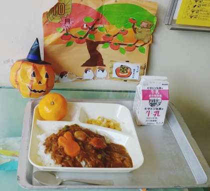 「ポークカレーライス[米粉]」は、小麦アレルギーのある児童も食べられるように米粉のカレールウの素を使用しています。豚肉を主材に、じゃがいも、たまねぎ、にんじん、青みにグリンピースを使用しています。