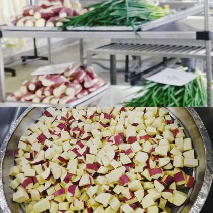 「体ポカポカ鶏肉のしょうが焼き」は、鶏肉にしょうが汁、にんにく、砂糖、料理酒、みりん、こいくちしょうゆ、綿実油で下味をつけ、たまねぎを合わせて焼き物機で焼きます。