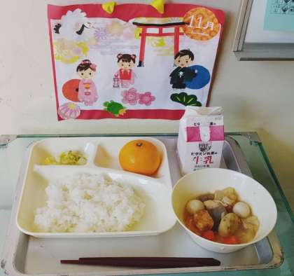 「関東煮」は、鶏肉、うずら卵、ごぼう平天、じゃがいも、こんにゃく、あつあげ、だいこん、にんじんを使用しています。この献立は【うずら卵】の個別対応献立です。