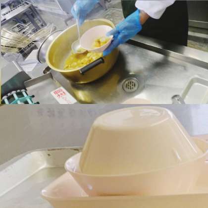 「はくさいの甘酢あえ」は、焼き物機で蒸し、砂糖、塩、米酢を合わせたタレをかけ、あえています。