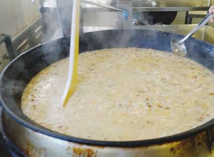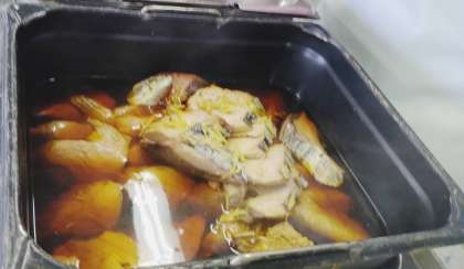 「なまりぶしのしょうが煮 」は ミニバットになまりぶし、調味液を入れ、せん切りのしょうがを加え、焼き物機で煮ています。