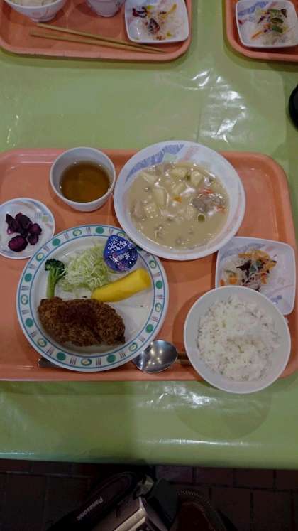 夕食はホワイトシチュー、ミンチカツでした。ゼリーも付いていました。