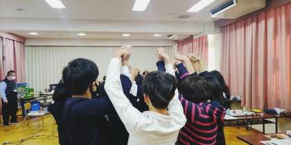 最後には、みんなで手をつないで電流を流し電気を実際に体験しました。