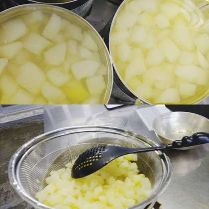 「あじのレモンマリネ」は、小学校、中学校ともに1人1枚のあじをなたね油であげ、いためたたまねぎと生のレモンをしぼった果汁などで作った調味液をからませます。レモン汁は、最後に加えることで風味を残すようにしています。