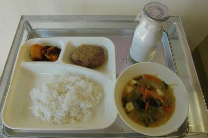 和風おろしハンバーグ・みそ汁・かぼちゃのいとこ煮・ご飯・牛乳