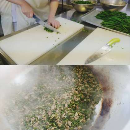 「豚肉とさんどまめのオイスターソースいため」は、豚肉、さんどまめをいため、こいくちしょうゆ、オイスターソースで味つけしています。