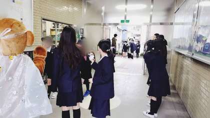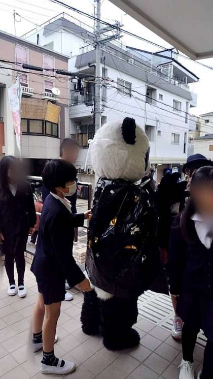 片江小学校のキャラクーの「かっくん」「たえちゃん」が玄関でお出迎えをします。