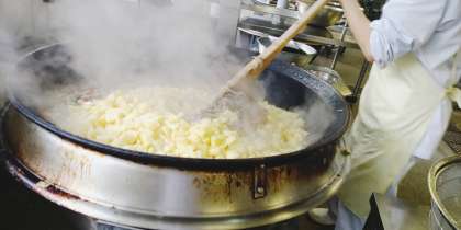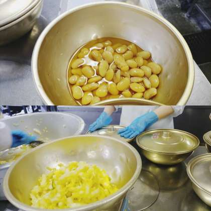 「白花豆の煮もの」は、焼き物機で煮ます。白花豆は、鉄や食物繊維が多く含まれており、児童に食べてもらいたい食品です。