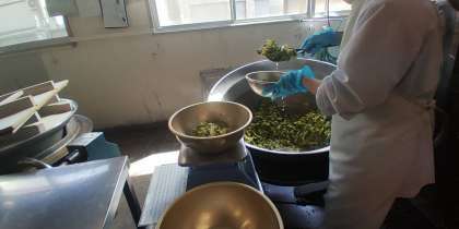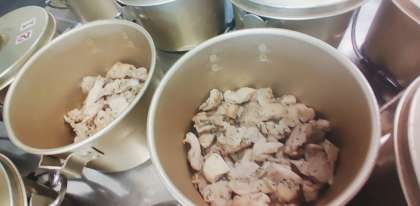 「鶏肉のバジル焼き」は、鶏肉をワイン、塩、こしょう(粗挽)、バジル、オリーブ油で下味をつけ、焼き物機で焼きます。