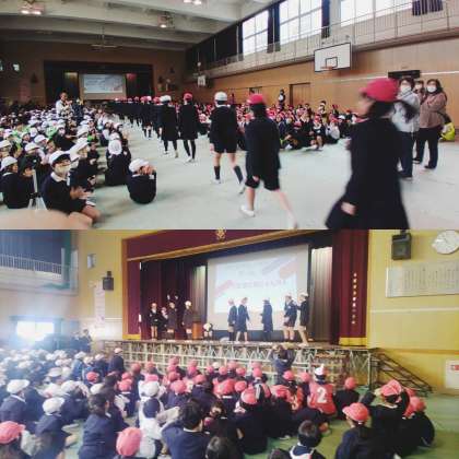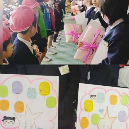 6年生の為に歌を歌い、一緒にゲームをしました。じゃんけんや・学年まつわるクイズをしました。みんな一生懸命遊びをしました。6年生からは、ぞうきんをもらいました。みんなで大事に使っていきます。最後に、片江小学校の校歌を歌いました。