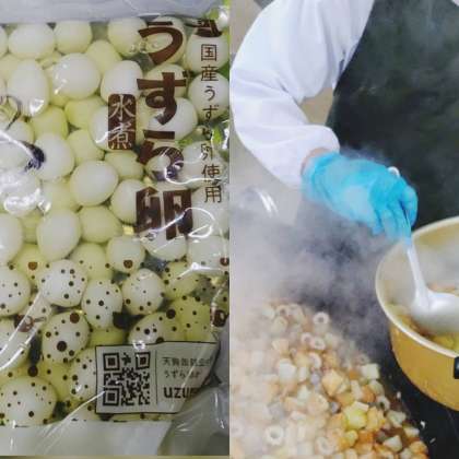 「関東煮」は、鶏肉、うずら卵、ちくわ、じゃがいも、こんにゃく、あつあげ、だいこん、にんじんを使用しています。この献立は、【うずら卵】の個別対応献立です。