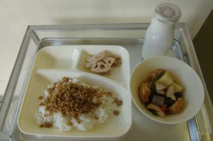 鶏肉とじゃがいもの煮もの・焼きれんこん・紅ざけそぼろ・ごはん・牛乳